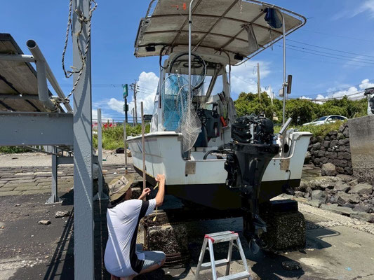 船があがったら高圧洗浄機で洗い流し、黒ペンキを塗りました。